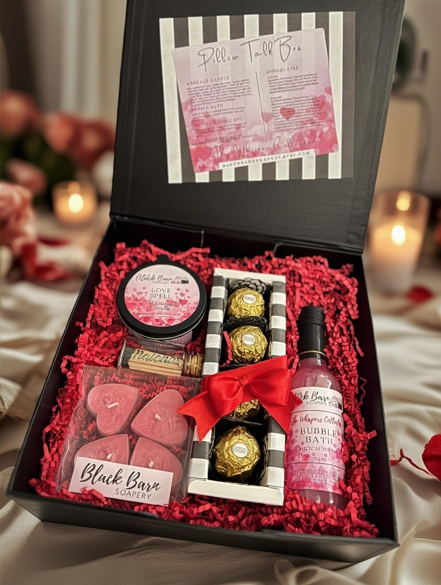 The Pillow Talk Box from the Whispers Collection is a luxurious, intimate gift set designed to create magical, romantic moments and spark whispered connections between partners. Encased in an elegant gray box adorned with a striking red heart motif and "Pillow Talk Box" script, this thoughtfully curated collection invites you to unwind, indulge, and turn an ordinary evening into something seductive and special.Inside this enchanting box, you'll find everything needed for a sensual, pampering experience: